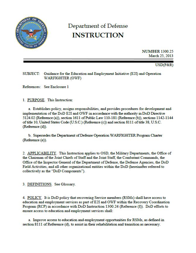 Department of Defense Instruction (DODI) 1300.25: Guidance for the Education and Employment Initiative (E2I) and Operation Warfighter (OWF)